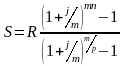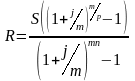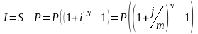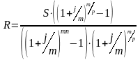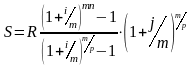Если взносы в размере R будут вноситься P раз в году в конце расчетных периодов, на суммы на счете m раз в году будут начисляться сложные проценты по номинальной годовой ставке j, выражение для суммы всех взносов с начисленными процентами за n лет, которое можно аналогичным образом, будет иметь вид: