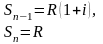 Если взносы вносятся регулярно одинаковыми суммами через одинаковые периоды, можно сразу определить сумму вклада с начисленными процентами и сумму начисленных процентов за весь срок. Например, если ежегодно в конце каждого года в течение n лет на депозитный счет будет поступать сумма R, а проценты на хранящуюся сумму будут начисляться по сложной годовой ставке i, суммы последовательных взносов с процентами, срока хранения вклада, по формуле (35) будет равны: