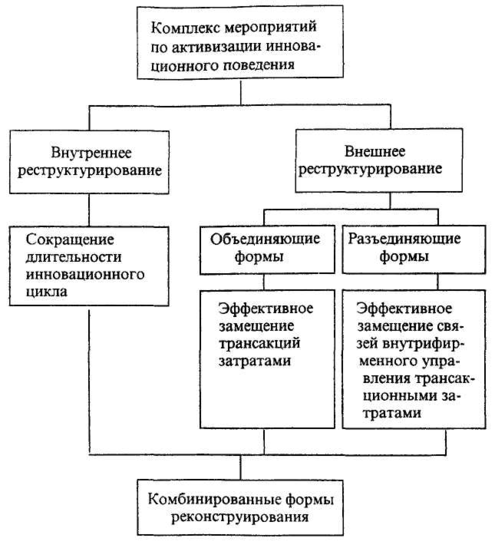 Разработка комплекса мероприятий активизации инновационного поведения предприятия преследует цель повышения эффективности инновационного цикла. Оно может достигаться как за счет увеличения динамизма путем прямого сокращения длительности отдельных его элементов, так и за счет сокращения затрат на реализацию этих элементов цикла инновации. Но в любом случае реализация комплекса мероприятий активизации инновационного поведения приводит к изменению структуры предприятия - реструктурированию, которое представляет собой изменение структуры капитала, собственности и схемы владения для адаптации к условиям рынка.