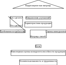 Корреляционная матрица заполняется символами, указывающими на положительную или отрицательную корреляционную связь между различными техническими характеристиками продукции с точки зрения потребителя.