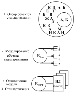 На примере модели конкретного объекта рассмот-рим механизм стандартизации (рис. 4). Можно выде-лить четыре этапа работ по стандартизации [17, 44]