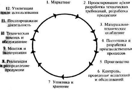 На этапе маркетинга изучаются требования заказчика продукции. На этапе проектирования разрабатывается продукция, отвечающая всем требованиям Потребителя. На стадии производства обеспечивается уровень качества, заложенный в проекте. При обращении должно быть сохранено сформированное качество в период транспортирования. хранения, подготовки к продаже, реализации. На стадии эксплуатации к управлению качеством подключается непосредственно потребитель продукции. От того, насколько он будет грамотно использовать (эксплуатировать) продукцию, будет зависеть ее качество, в частности срок службы. На стадии утилизации необходимо предупредить вредное воздействие использованной продукции на окружающую природную среду.