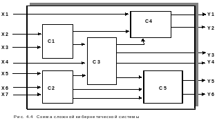 Учитывая относительность понятия, кибернетическую систему можно рассматривать как состоящую из частей (элементов), взаимодействующих друг с другом (рис. 4.4). В этом случае большинство выходных величин одной части одновременно являются входными величинами для другой части системы. Оставшиеся каналы остаются свободными, составляя входы и выходы всей системы в целом.