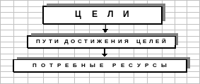 Предлагаемая схема, как правило, никогда не вызывает отторжения, поскольку она реализует нормальный здравый смысл. Но тогда возникает другой вопрос, если все так просто и понятно, то почему же у нас очень часто провозглашались (да и сейчас провозглашаются) очень хорошие цели, которые, как потом оказывалось, изначально были недостижимыми (либо не были указаны четкие пути их достижения, либо отсутствовали необходимые ресурсы, либо то и другое вместе). Это и такая цель, как “нынешнее поколение советских людей будет жить при коммунизме”, либо “каждой семье квартиру к 2000 году” и многие другие. Причем, чем грандиознее эти цели, тем больше всевозможных ресурсов тратится (большей частью впустую). Создается впечатление, что чем выше уровень руководителя, определяющего глобальные цели, тем меньше здравого смысла в его действиях по их оценке
