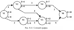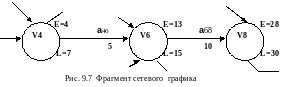 Это означает, что начало работы a46 можно отодвинуть от самого раннего срока не больше чем на 4 дня, не влияя на наступление раннего срока свершения события V6. Как видим, свободный резерв времени работы является той частью ее полного резерва, которая может быть использована без изменения резерва последующих работ. Использование свободного резерва времени на стадии планирования уменьшает резервы предшествующих работ.