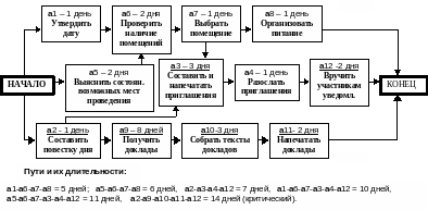 В качестве примера такого представления рассмотрим расписание по подготовке научного семинара. В таблице приведено описание работ (действий) с указанием их продолжительностей и последовательности. Последовательность задается через указание непосредственно предшествующей работы.