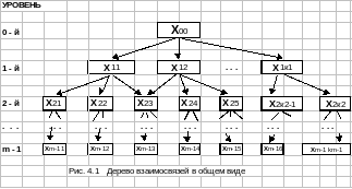 Дерево взаимосвязей, в общем виде, изображено на рис. 4.1. Оно представляет граф G=(X,R), где X={X0,X1,...,Xm-1} - множество элементов, принадлежащих m-уровню дерева взаимосвязей. На нулевом уровне представлен начальный элемент (цель, мероприятие, ресурс) - X0. Множество элементов на i-м уровне определяется как Xi={xi1,xi2,...,xiki}, 0 <= i <= m-1, где i - номер уровня дерева взаимосвязей, а ki - количество элементов на i-м уровне.