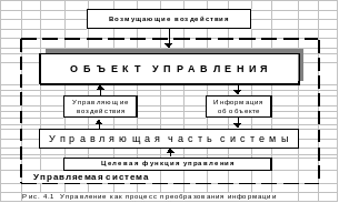 Управление в организованных системах рассматривается, прежде всего, как процесс преобразования информации (смотри рис. 4.1): информация об объекте управления воспринимается управляющей системой, перерабатывается в соответствии с той или иной целью управления и в виде управляющих воздействий передаётся на объект управления. Поэтому понятие информации принадлежит к числу наиболее фундаментальных понятий кибернетики.