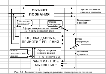 Схема диалектического пути познания раскрывает суть информационного взаимодействия активного познающего субъекта и исследуемого объекта в плане “основного вопроса философии”, отражая механизм движения познания от относительной истины к абсолютной. Каждый текущий результат оценивается на фоне всевозрастающего уровня знаний. Это и есть диалектический путь, логика познания, которое и есть “вечное, бесконечное приближение мышления к объекту” [19], к все большему соответствию наших представлений объективной природе вещей.