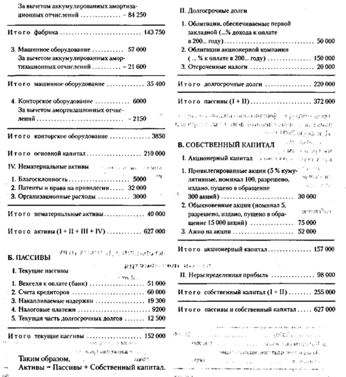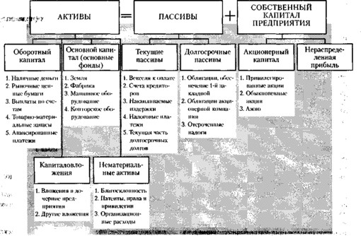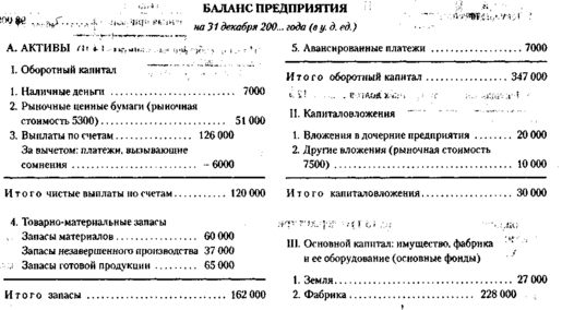 То, чем располагает предприятие, называется активами. Они помещаются в левой части баланса. Задолженности называются пассивами и располагаются в правой части баланса. Кроме того, в правой стороне указывается также собственный (в акционерном обществе его называют акционерным) капитал предприятия - стоимость его имущества за вычетом обязательств.