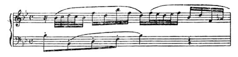 Второй мотив сгущает внутреннюю активность темы скачком на сексту к ее интонационной вершине (си-бемоль). Этот второй мотив правильнее назвать субмотивом, поскольку вся тема представляет по сути один мотив, объединяющий два субмотива, различие которых здесь весьма существенно как в чисто методическом плане, так и для понимания интенсивности развития пьесы, вырастающей из первого ритмически контрастного субмотива.