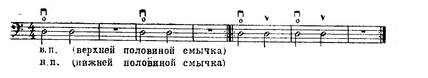 По мере того, как ученик приучается свободно вести смычок в средней его части, можно перейти к упражнениям верхней половиной, а затем (через 1-2 урока) нижней половиной смычка (от колодочки примерно до середины):