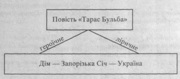 Зображення історичних подій в Україні, побуту й» звичаїв Запорозької Січі в повісті «Тарас Бульба». Патріотичний пафос твору. Уславлення військового товариства, романтичне звеличення подвигу, засудження зради. Втілення суперечливих рис українського козацтва в образі Тараса Бульби. Протиставлення життєвого вибору в долях його синів. Цілісність натури Остапа, його самовідданість ідеї захисту рідної землі. Трагедія Андрія; конфлікт почуття та обов'язку. Майстерність розкриття характерів героїв. Картини української природи.