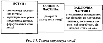 Зміст лекції визначається робочою навчальною програмою, але лектор (професор, доцент) має право не обмежуватися у питаннях трактування навчального матеріалу, формах активізації пізнавальної діяльності студентів. Можливе читання окремих лекцій з проблем, які стосуються навчальної дисципліни, але не охоплені програмою. Такі лекції проводяться провідними науковцями кандидатами та докторами економічних наук. Лекції проводять у спеціально обладнаних приміщеннях для однієї або для декількох академічних груп за певними етапами (рис. 4.1).