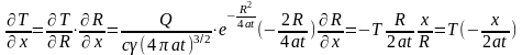Производную ∂T/∂x, т.е. градиент температуры в направлении ОХ вычислим по правилу дифференцирования сложных функций