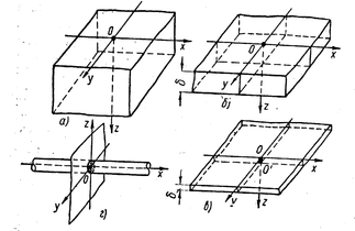 1. Бесконечное тело – тело (рис.4.1, а), которое имеет такую протяженность по осям oX, oY, oZ, при которой его границы не влияют на характер теплового поля, т.е. его можно заменить бесконечным телом, у которого имеется неограниченная протяженность по всем трем направлениям.