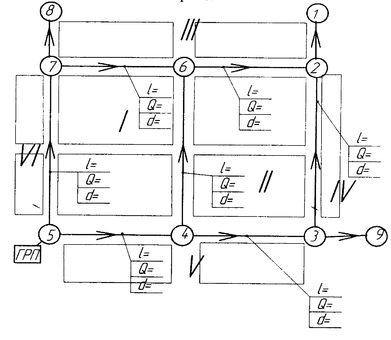 Расчетная схема выполняется без масштаба. Распределительная сеть разбивается на участки. Границами участков являются точки, в которых резко меняется расход газа (присоединение ответвлений, точки подключения крупных потребителей), а также точки разделяющие участки большой протяженности (≥ 400 м) на более короткие.