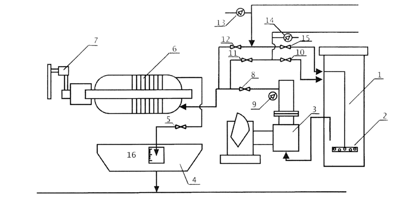 4. Открыть вентиль (8) на трубопроводе подачи суспензии в фильтр-пресс и закрыть вентиль на трубопроводе подачи суспензии к барабанному вакуум-фильтру.