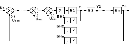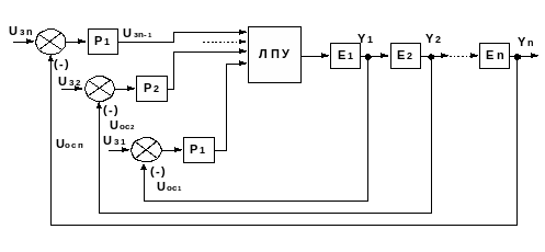 Каждому параметру соответствует свой регулятор Р1n и свой сигнал задания ( Uз1...Uзn) .В такой системе в каждый момент времени регулируется только один параметр. Это обеспечивает логическое переключающее устройство ЛПУ , которое подключает на вход системы выход регулятора воздействие которого в данный момент является определяющим .