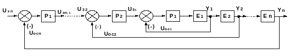 Регулирование параметров осуществляется последовательно. Каждому регулирующему параметру соответствует свой регулятор . Задающий сигнал каждого последующего регулируемого параметра соответствует выходу предыдущего регулятора.