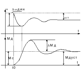 Мд = f(t) (Рис. 10-8.) наибольшее отклонение скорости дин от ее начального значения называют динамическим падением скорости, а статическую ошибку - статическим падением скорости.