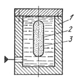 Гидростатическое прессование (рис. 8.2) применяют для получения металлокерамических заготовок, к которым не предъявляются высокие требования по точности геометрических размеров. Сущность процесса состоит в том, что порошковую массу 3, заключенную в эластическую оболочку 2, подвергают равномерному и всестороннему давлению в герметичной камере 1. В качестве рабочей жидкости, передающей давление на эластичную форму, применяют масло, воду, глицерин и др.
