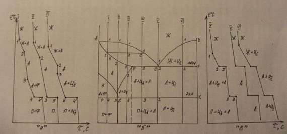 5. Из каких структурных состовляющих,из каких фаз и какого состава состоит структура сплава IV после окончания кристаллизации(точка 2 на кривой охлаждения) ? (рис.2)