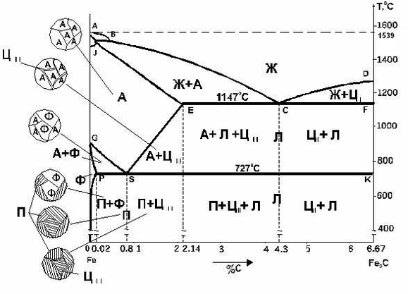 Рисунок 1.Диаграмма состояния (фазового равновесия) железо-цементит(Fe-Fe3C)