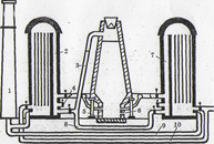 Сущность процесса заключается в том, что через расплавленный чугун и небольшое количество металлического лома черных металлов, загруженных в конвертор, продувается кислород, образуется оксид железа FO, который, взаимодействуя с углеродом и примесями чугуна, окисляет и обращает их в газ и шлак. Реакции окисления идут с выделением тепла. Чугун при этом превращается в сталь. Конвертер с кислородным дутьем (рис. 2) состоит из стального корпуса, футерованного огнеупорным кирпичом. Конвертер имеет поворотное устройство, с помощью которого может устанавливаться в наклонном положении. В таком положении его заливают жидким чугуном, затем устанавливают вертикально и через фурму производят продувку кислородом. По окончании процесса конвертер вновь наклоняют и выпускают сталь и шлак.
