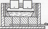 Глинозем представляет собой прочное химическое соединение, температура его плавления — 2050 °С. В этих условиях восстановление алюминия из глинозема весьма затруднительно. Поэтому алюминий получают электролизом из глинозема, растворенного в расплавленном криолите (ЗNаFuА1F3). Процесс проходит в электролизных ваннах (электролизерах). Ванна (рис. 8) представляет собой металлический корпус, футерованный углеродистыми блоками. В них вставляются медные катодные шины. Сверху в ванну опускается угольный электрод, представляющий собой анод.