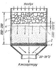 Сущность агломерации поясняет схема, приведенная на рис. 3. После зажигания газовыми горелками начи­нается горение топлива, причем зона горения постепенно перемещается вниз. Воздух просасывается через слой шихты (200 - 350 мм) с помощью вакуумных устройств (эксгаустеров). В зоне горения при 1300 - 1500° С про­исходит спекание шихты в пористый продукт - агломе­рат. При нагревании образуются, а затем расплавляют­ся относительно легко­плавкие соединения. Об­разующиеся жидкие фа­зы обтекают, смачивают и связывают твердые час­тицы шихты. При после­дующем охлаждении жидкость затвердевает, обеспечивая образование прочных кусков агломе­рата.