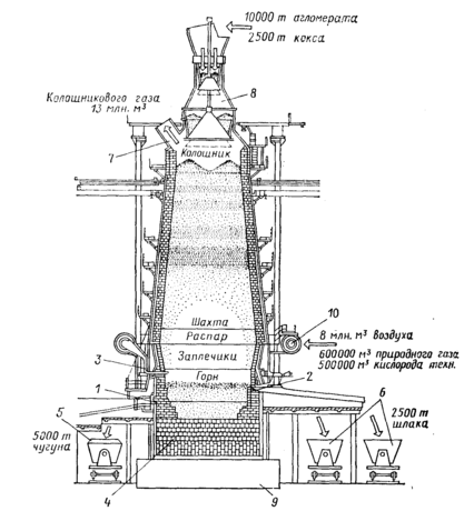 Рис. . Схема доменной печи 2700 м3 и ее примерный суточный баланс:1 — чугунная летка; 2 шлаковая летка; 3 фурменный прибор; 4 — лещадь; 5 — чугу-нопоз; 6 шлаковозы; 7 — газоотводы; 8 — засыпное устройство; 9 — фундамент; 10 — воздухопривод дутья