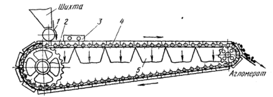Агломерацию — процесс окускования мелкой руды, концентратов и т. п. спеканием — наиболее часто прово­дят на машинах ленточного типа. Они представляют со­бой конвейер, состоящий из большого количества спекательных тележек, двигающихся по направляющим рельсам (рис.).