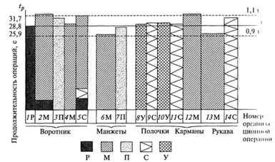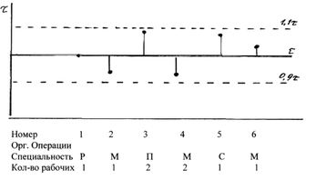 Поток в целом считается согласованным правильно, если Кс = 1 ±0,02; если Кс < 1 – в потоке больше недогруженных операций, если Кс > 1 – в потоке больше перегруженных операций. Если коэффициент согласования отклоняется от единицы более допустимого, то уточняют такт потока. Графический анализ производится по графику синхронности, диаграмме синхронности операций и монтажному графику – схеме перемещения полуфабриката.