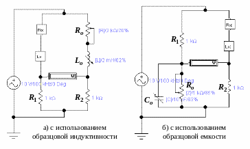 На практике образцовые переменные индуктивности изготовить очень трудно, а активные сопротивления катушки довольно велики. Поэтому в основном распространены мостовые схемы измерения индуктивностей (имеющих малую добротность ) с использованием образцовых емкостей (рис. 3б). Если в схеме , то исходя из условия равновесия моста , можно записать