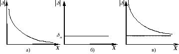 Рис. 3. Вид относительной погрешности прибора: а) при аддитивной полосе; б) при мультипликативной полосе; в) при совокупности аддитивной и мультипликативной составляющих