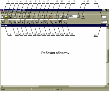 Большая центральная область - рабочая область окна, где Вы формируете и проверяете схему.