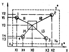 Пример 3. На площадке, ограниченной координатами от X* до Х* и Y* до Y* установлены 4 насоса (рис.9.4). Требуется поставить общий сборник так, чтобы суммарная длина трубопроводов, идущих от насосов к сборнику была минимальной. Таким образом, критерием оптимизации является длина трубопроводов.