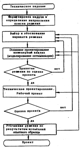 Некоторые распространенные логические схемы процессов проектирования приведены в книгах Дж. Джонса [7], Дж. Диксона. [8], А.И. Половинкина [9]. На рис.9.5 приведена типовая логическая схема традиционного не автоматизированного проектирования, заимствованная из [5].