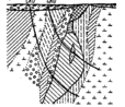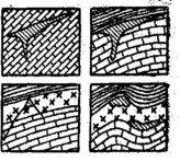 | Жильні – поділяють на прості та складні. Проста жила – це поодиноке рудне тіло, складна – це сукупність зближених жил та безлічі прожилків. Серед прости жил можна виділити: плитоподібні, рубцеві та лінзоподібні. Серед складних – сіткові, гілкові та сідлоподібні (див мал.). форма жил залежить від тріщин в земній корі | |