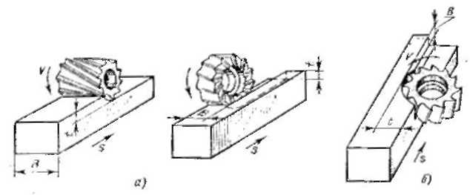 Отличительной особенностью торцовой фрезы от цилиндрической является наличие зубьев на одном из торцов. При этом, как и при цилиндрическом фрезеровании, срезаемый слой будет характеризоваться глубиной фрезерования t (рис.2), т. с. проекцией дуги контакта зубьев с заготовкой на направление, перпендикулярное движению подачи. Ширина фрезерования В на заготовке измеряется в направлении оси вращения фрезы. Отмстим, что в некоторых справочных материалах для расчета режимов резания эти обозначения меняются местами, что следует учитывать при их использовании. В зависимости от расположения торцовой фрезы относительно обрабатываемой поверхности различают симметричное и асимметричное фрезерование(рис.2 б).