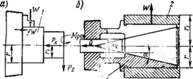 Рис. II 1.2 Различные варианты взаимодействия сил резаная и сил зажима на деталь, установленную в патроне (а) и на цанговой оправке (б)