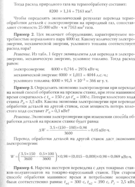 Решение: Сначала определяют количество электроэнергии на непосредственный нагрев деталей в электропечи: 25000 х 0,8 = = 20 000 (кВт-ч). Используя табл. 1, переводят полученный расход электроэнергии в эквивалентное количество условного топлива (у. т.):