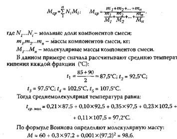 Решение. Нефть и нефтепродукты не являются индивидуальными веществами, представляют сложную смесь углеводородов и их соединений. Поэтому нефтяные фракции выкипают в интервале температур. Для их характеристики пользуются средней температурой кипения (среднеобъемной, среднемассовой, среднемолекуляр-ной и др.). Среднеобъемная, среднемассовая, среднемолекулярная температуры находятся по формулам: