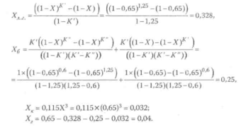 Пример 5. На установке каталитического крекинга с реактором ступенчато-противоточного типа при 475°С перерабатывается вакуумный газойль. Определить выход легкого газойля (X ), бензина (Х6), кокса (Хк), газа (Хг), если глубина превращения равна 65% масс. Макрокинетические коэффициенты К' и К" для шести секций аппарата равны 1,25 и 0,6.