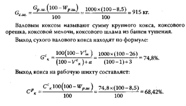 Пример 9. Рассчитать количество сухой шихты (Gcui) из 1000 кг рабочей шихты, загружаемой в камеру коксования, а также выход валового кокса, если влага в шихте W = 8,5%, выход летучих веществ валового кокса на сухую зольную массу Vек = 1%; разница на выход кокса, получаемого в производственных условиях и при определении летучих веществ в лабораторных условиях, а = 3%; выход летучих веществ шихты на сухую массу, Vе' - 26%.