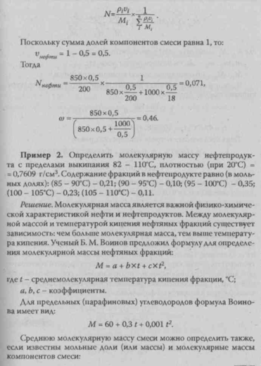 Пример 1. Определить молярную и массовую долю нефти в во-донефтяной эмульсии, если объемная доля воды в эмульсии 50%, молярная масса нефти 200 кг/моль, плотность ее 850 кг/м3, плотность воды 1000 кг/м3.