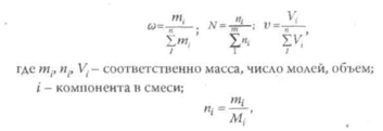 Массовая, молярная, объемная доли компонентов рассчитывается по выражениям:
