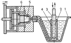 На машинах с горячей камерой прессования (рис.7.2) камера прессования 2 расположена в обогреваемом тигле 1 с расплавленным металлом. При верхнем положении плунжера 3 металл через отверстие 4 заполняет камеру прессования. При движении плунжера вниз отверстие перекрывается, сплав под давлением 10…30 МПа заполняет полость пресс-формы 5. После затвердевания отливки плунжер возвращается в исходное положение, остатки расплавленного металла сливаются в камеру прессования, а отливка удаляется из пресс-формы выталкивателями 6.