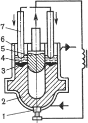 В качестве расходуемого электрода используется прокат. В кристаллизатор 6 заливают расплавленный шлак 4 (фторид кальция или смесь на его основе), обладающий высоким электро - сопротивлением. При пропускании тока через электрод 7 и затравку 1 выделяется значительное количество теплоты, и шлаковые ванна нагревается до 1700? C, происходит оплавление электрода. Капли расплавленного металла проходят через расплавленный шлак и образуют под ним металлическую ванну 3. Она в водоохлаждаемой форме затвердевает последовательно, образуя плотную без усадочных дефектов отливку 2. Внутренняя полость образуется металлической вставкой 5.
